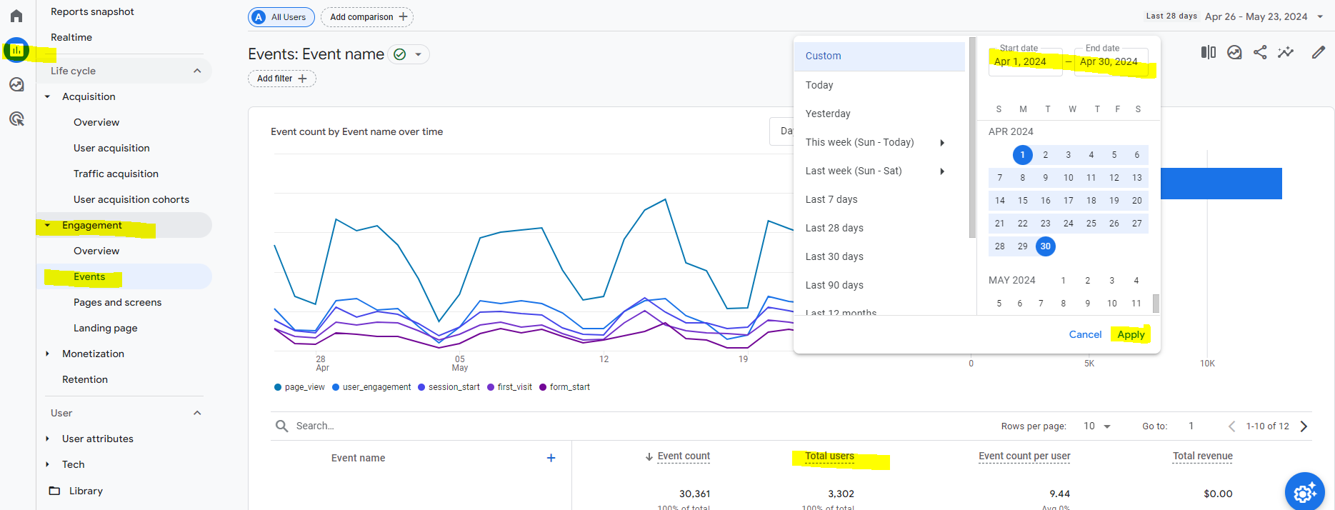 Total Visitors: this data is pulled from Google Analytics and can be found under Reports → Engagement → Events. The date can be adjusted in the upper right.