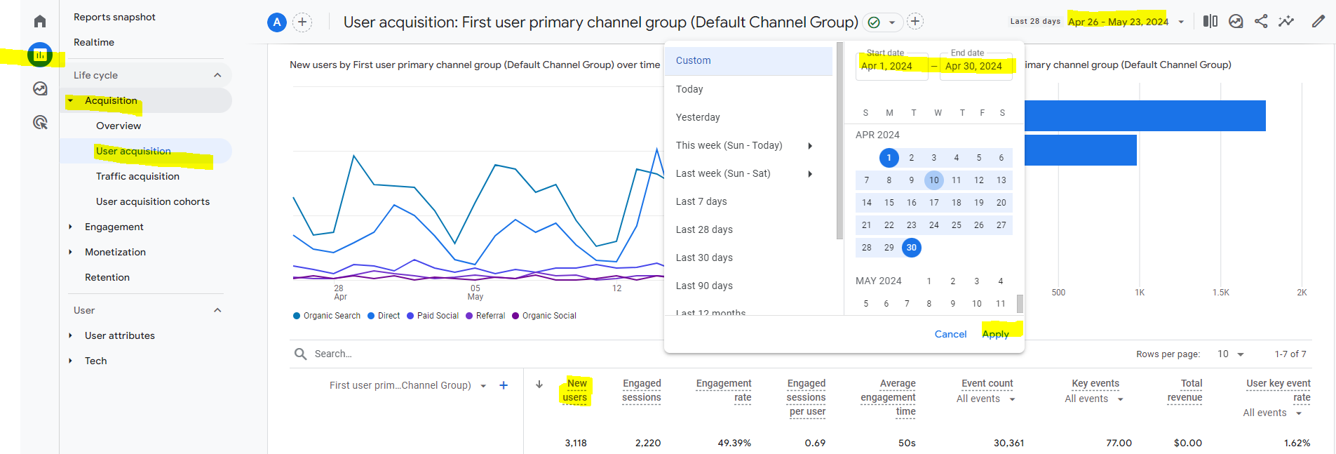 New Visitors: this data is pulled from Google Analytics and can be found under Reports → Acquisition → User Acquisition. The date can be adjusted in the upper right.