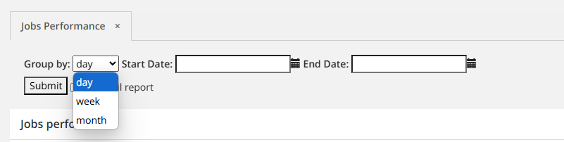 The Job Performance report is the only report in this set that can be filtered to a smaller time frame. This report can be broken down to a specific timeframe based on days, weeks, or months.