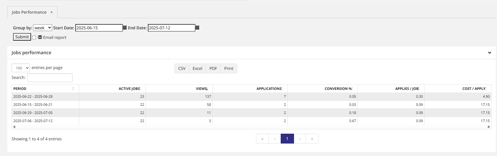 Similar to the Career Portal stats email, this report can provide you with an overview of your job performance for the selected timeframe. A great tool if you want to look back on data or accidentally delete the stats email!