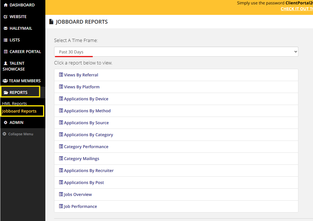 Jobboard Reports is a tool within MyHaley that can be accessed at any time to see a variety of data points related to your Career Portal. This data may seem familiar - some of it is the same as your weekly Career Portal Stats email!